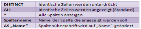 SELECT [DISTINCT] [ALL] { * | Spaltenname1 [Alias] [,Spaltenname2 [Alias], ...]}