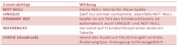 Beim Anlegen einer Tabelle können optional Constraints (Bedingungen) angegeben werden. Diese werden beim Erzeugen/Ändern/Löschen von Tabelleneinträgen überprüft. Bei Verletzungen der Constraintbedingung wird die Operation nicht durchgeführt.