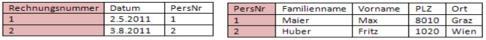 Die 2. Normalform muss nicht nochmal geprüft werden, da unser Schlüssel aus nur einem Attribut besteht und somit alle anderen Attribute voll funktional abhängig von diesem sind. Wir überprüfe aber, ob irgendwelche Elemente transitiv abhängig von anderen Elementen sind. Dabei wird klar, dass sowohl Familienname und Vorname, als auch Ort und PLZ eindeutig durch die Personennummer (PersNr) identifiziert werden können. In der 3. Normalform darf dies aber nicht sein. Deswegen lagern wir diesen Teil der Tabelle in eine neue Tabelle aus.