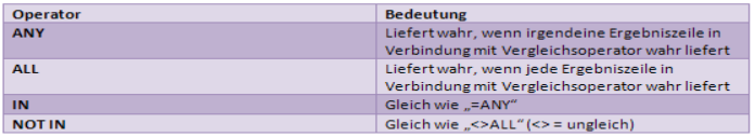Bei diesen Subselects wird immer nur genau 1 Ergebniszeile zurückgeliefert welche mit Vergleichsoperatoren (<, >, =, …) kontrolliert werden kann. Das Subselect ist fehlerhaft, wenn keine bzw. mehrere Ergebniszeilen zurückgeliefert werden.